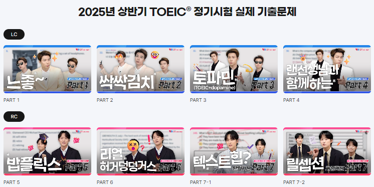 그 바로 아래 LC, RC 각각의 파트별로 모~든 해설 영상이 있습니다. 유튜브로 언제 어디서나 시청할 수 있는 만큼 '밥플릭스'처럼 밥 먹을 때 자투리 시간을 활용해서도 공부해 보세요! 실제 기출문제 영상을 전격 활용해서 열심히 학습하다 보면 어느새 '토익 졸업'의 꿈이 성큼 다가와 있을지도.. ✨