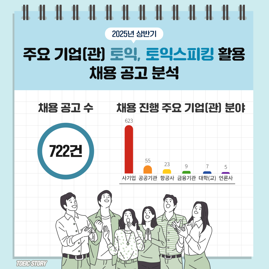 2025년 상반기 채용 시장은 경기 불확실성 속에서도 다양한 산업군에서 인재 확보 경쟁이 이어졌습니다. 특히 많은 기업들이 TOEIC과 TOEIC Speaking 성적을 지원자의 글로벌 역량 평가 지표로 활용하고 있었는데요. 이번 콘텐츠에서는 상반기 채용을 진행한 주요 722개 기업의 공고를 분석해, TOEIC 및 TOEIC Speaking 성적 활용 현황을 종합적으로 정리했습니다. 지금부터 그 내용을 함께 살펴볼까요? :)