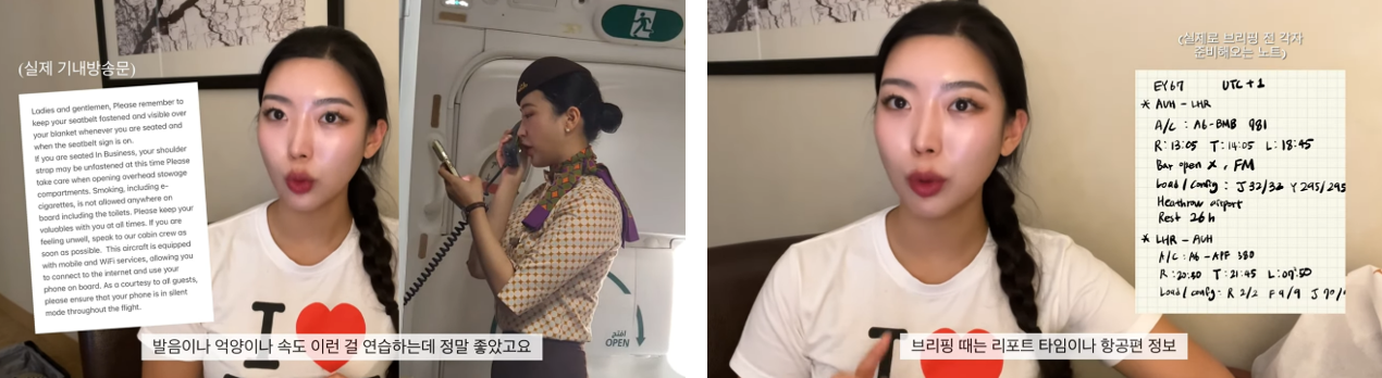 에티하드항공 비즈니스 클래스에서 근무 중인 3년 차 승무원은 토익스피킹이 실무와 얼마나 닮아 있는지 구체적인 사례를 들어 설명했습니다. 기내 방송처럼 문장을 정확하고 또렷하게 읽는 업무는 Part 1과 연결되고, 비행 전 브리핑에서 항공편 정보를 명확하게 전달하는 과정은 Part 4 유형과 거의 일치한다고 전했습니다.
