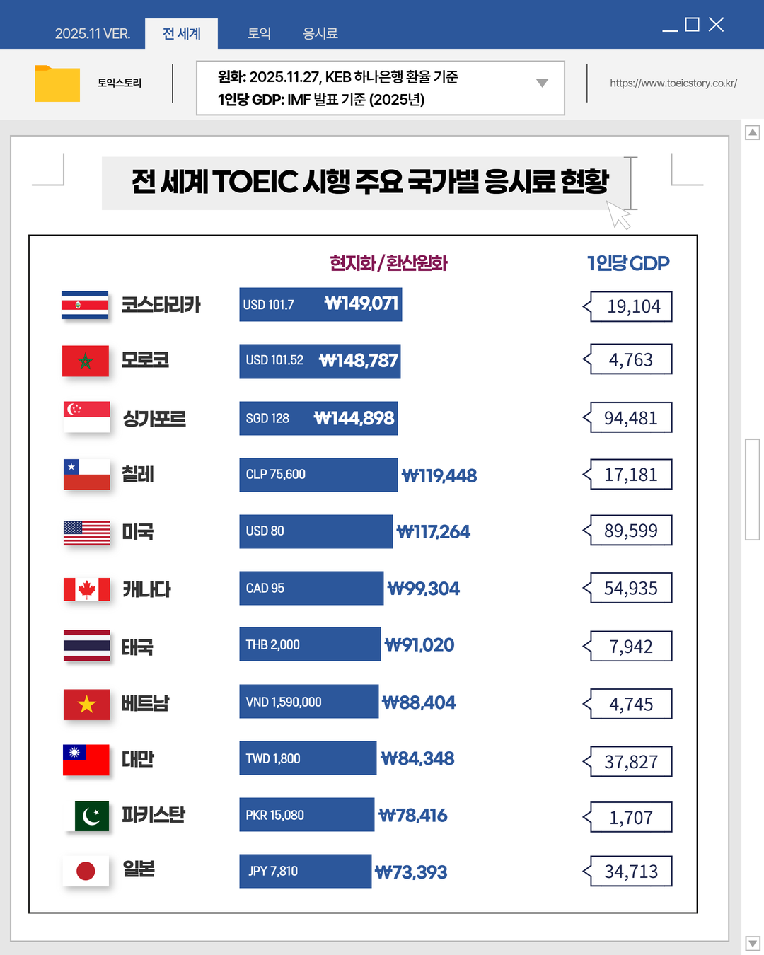 | No. | 국가 | 2025.11 응시료 (현지화) | 2025.11 응시료 (한화) | GDP |