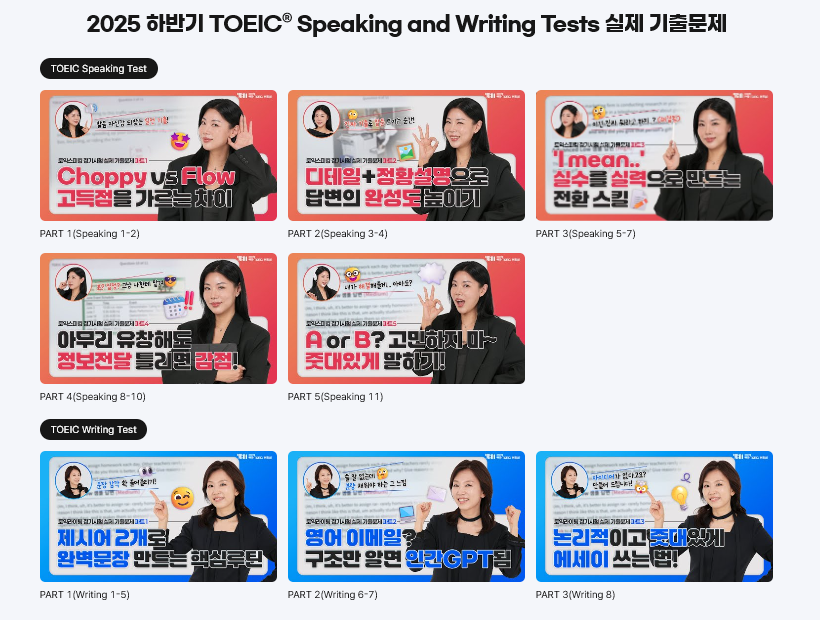 '토익스피킹&토익라이팅 정기시험 실제 기출문제 10차' 페이지에 접속하시면, 2025년 하반기 실제 기출문제 해설 강의들이 모여있는데요. 토익스피킹은 YBM강남센터 조마리 강사가, 토익라이팅은 YBM종로e4u 정은순 강사가 해설 강의를 전해드립니다.