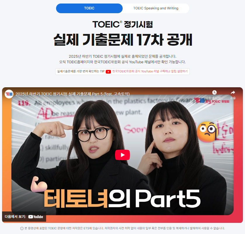 2025년 하반기 토익 정기시험 실제 기출문제 17차 공개 소식, 유익하게 확인하셨나요? 🙆🏻♀️ 다가오는 2026년, 토익과 함께 부푸는 마음으로 새로운 시작을 준비하는 분들이 많을 것 같습니다. 토익 실제 기출문제를 통해 열심히 학습하시고, 원하는 목표 성적 달성하시기를 힘차게 응원하겠습니다. 또, 토익과 관련된 소식은 YBM 한국TOEIC위원회 유튜브 채널을 통해 꾸준하게 전해드리고 있으니까요, 유튜브 채널 구독도 잊지 마세요. ✅