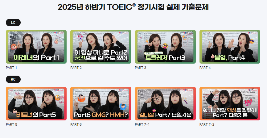 스크롤을 내리시면 2025년 하반기 토익 정기시험 실제 기출문제 영상을 파트별로 모두 만나보실 수 있어요. 막막하게 느껴졌던 토익 준비도 국밥처럼 든든한 실제 기출문제와 함께라면 걱정 없다! 🙅🏻♀️