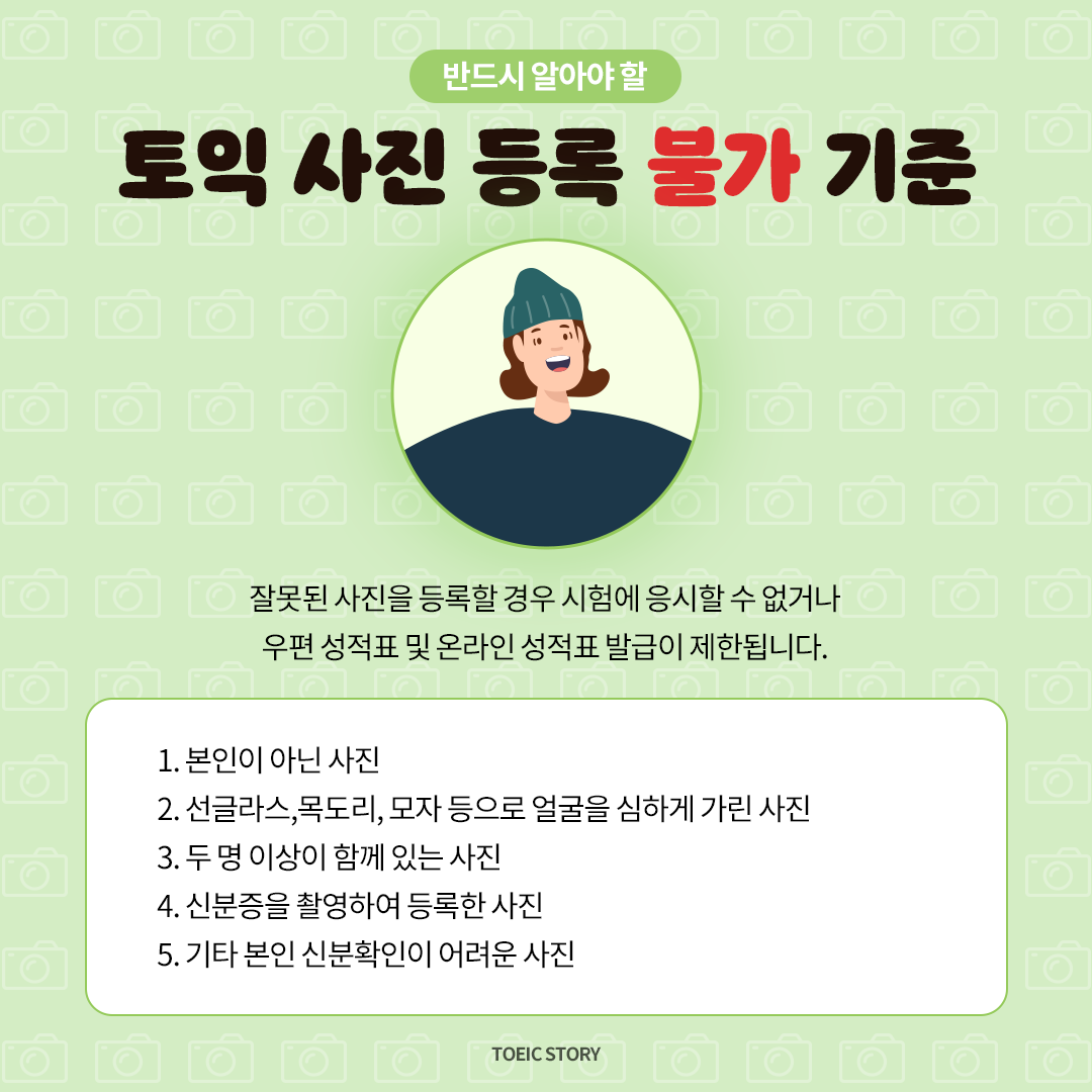 토익 접수 시에는 등록이 불가한 사진 유형도 반드시 확인해야 합니다. 가장 대표적인 사례는 본인이 아닌 사진을 등록한 경우인데요. 타인의 사진이나 과거와 외모 차이가 큰 사진은 본인 확인이 어렵기 때문에 허용되지 않습니다.