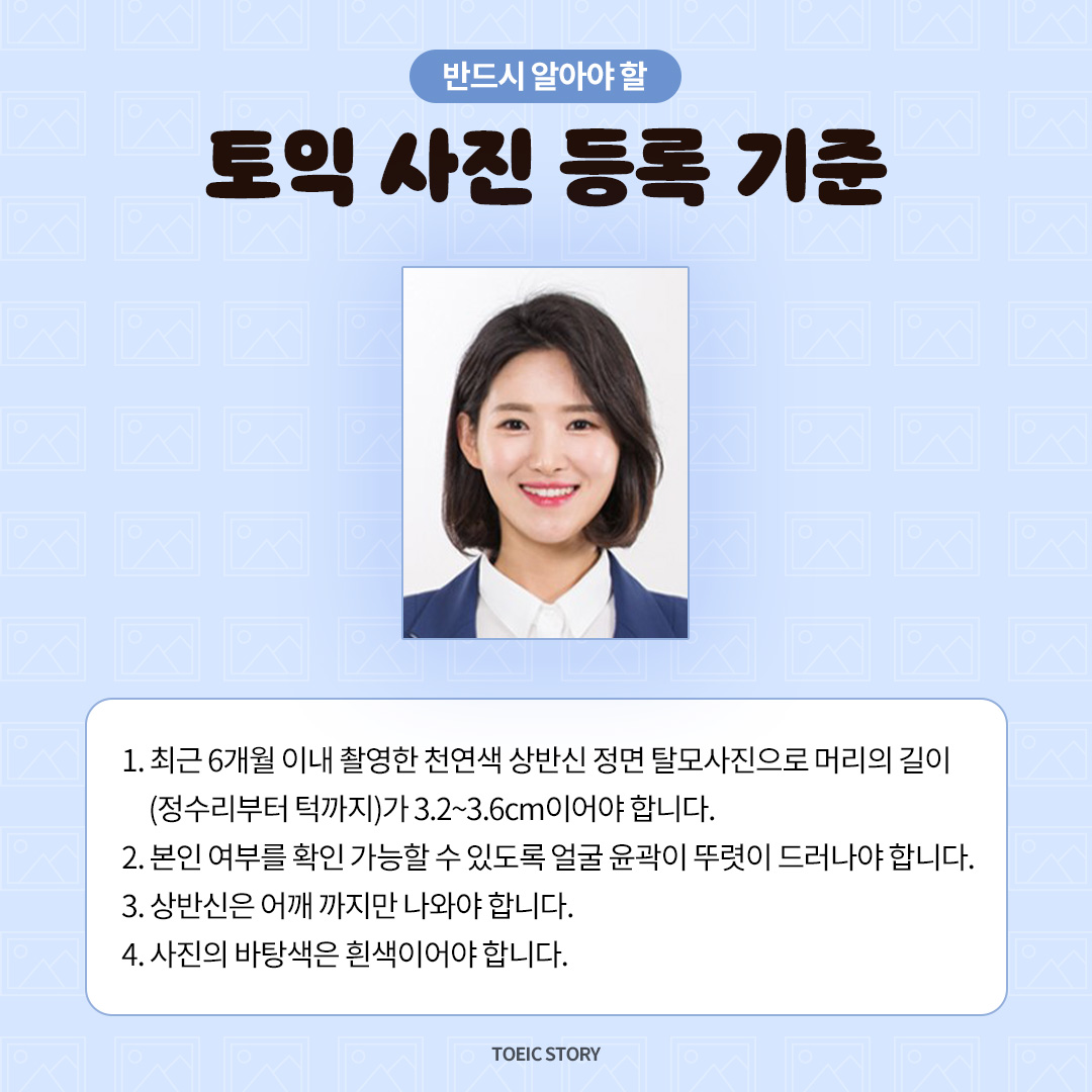 토익 접수 시 등록해야 하는 사진은 최근 6개월 이내에 촬영한 천연색 상반신 정면 탈모 사진이어야 합니다. 얼굴은 정면을 향하고 있어야 하며, 머리카락이나 장신구로 얼굴 윤곽이 가려지지 않아야 합니다. 정수리부터 턱까지의 얼굴 길이는 3.2~3.6cm로 규정되어 있어, 일반 증명사진과는 세부 기준이 다르기 때문에 촬영 시 유의가 필요하죠.