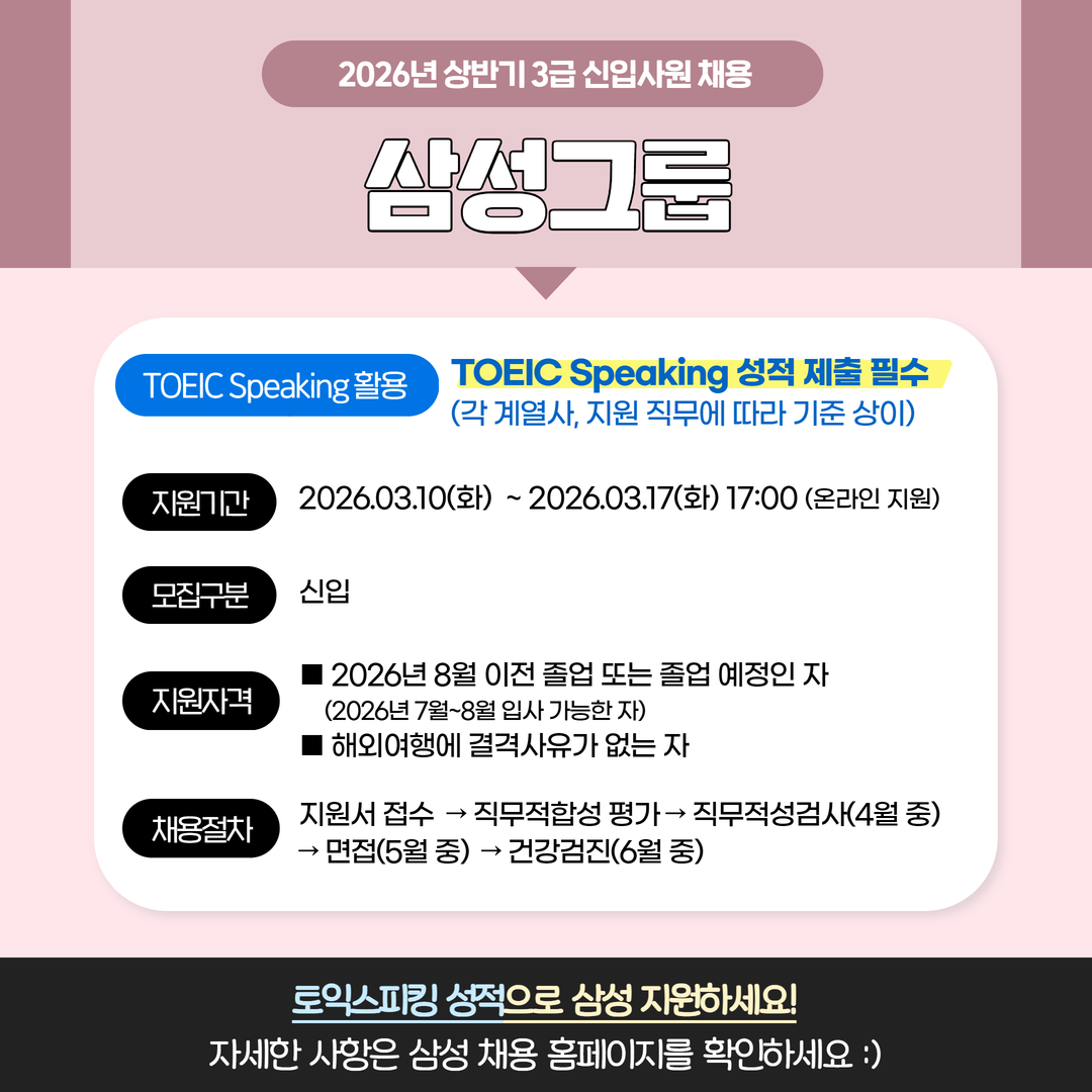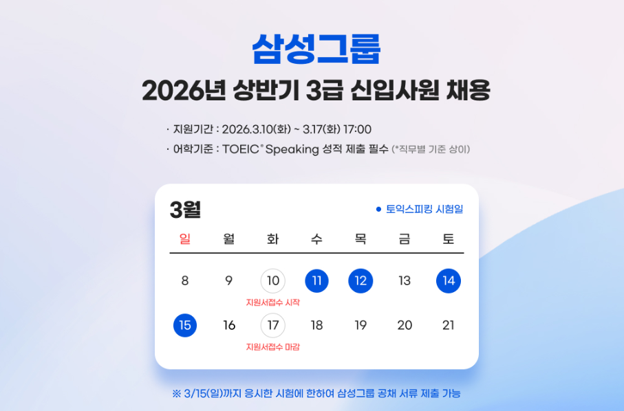 | 삼성그룹 | 신입 | 2026년 상반기 3급 신입사원 채용 공고 | 3.17(화) 17:00 | TOEIC Speaking 성적 제출 필수 (각 계열사, 직무에 따라 기준 상이) |