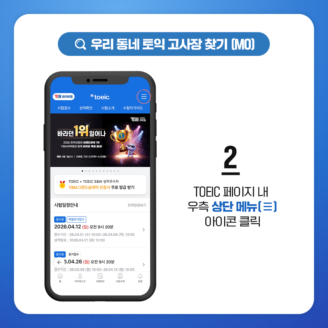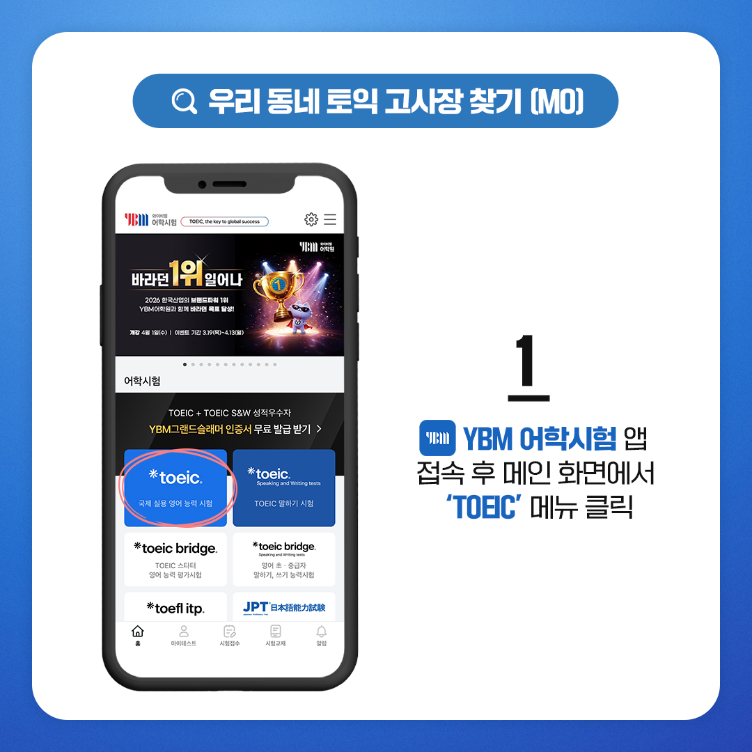 모바일에서도 토익 고사장을 간편하게 확인할 수 있습니다. ‘YBM 어학시험’ 앱을 활용하면 언제 어디서든 손쉽게 조회가 가능한데요. 먼저 앱에 접속해 로그인한 후 메인 화면에서 ‘TOEIC’ 메뉴를 클릭해 주세요.