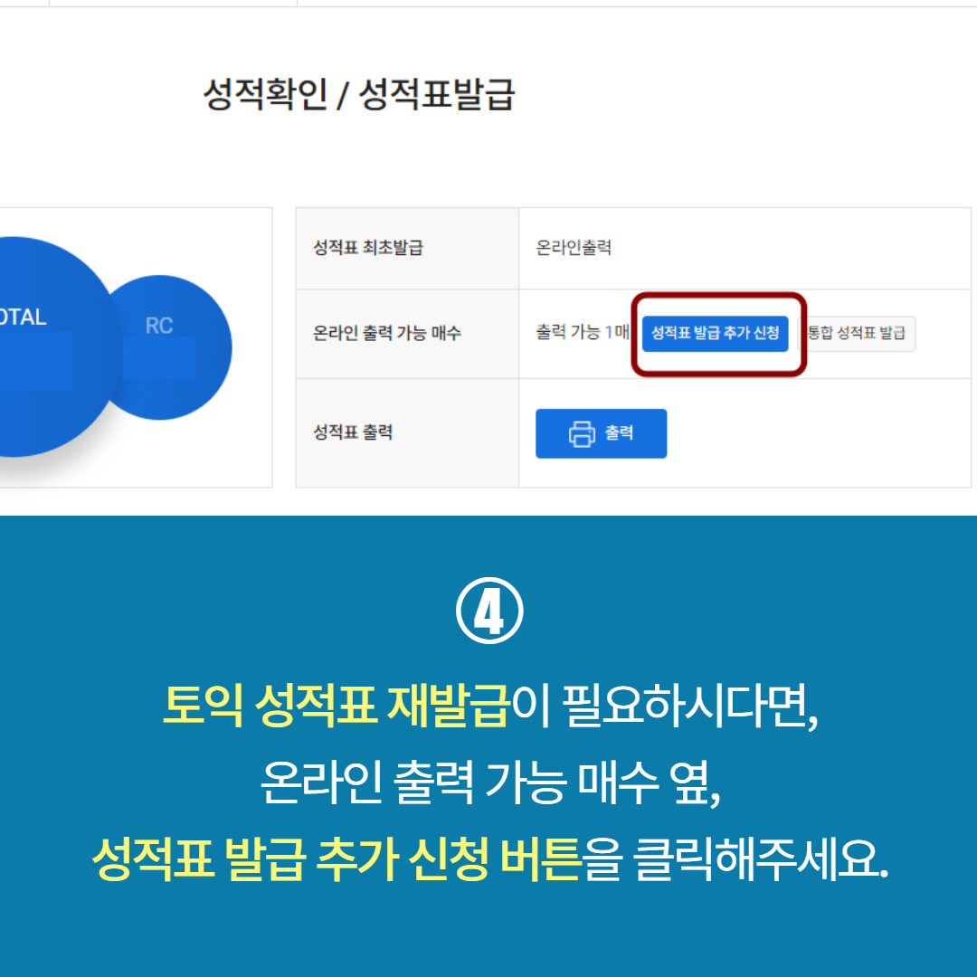 ④ 토익 성적표 재발급이 필요하시다면, 온라인 출력 가능 매수 옆 '성적표 발급 추가 신청' 버튼을 클릭해주세요.