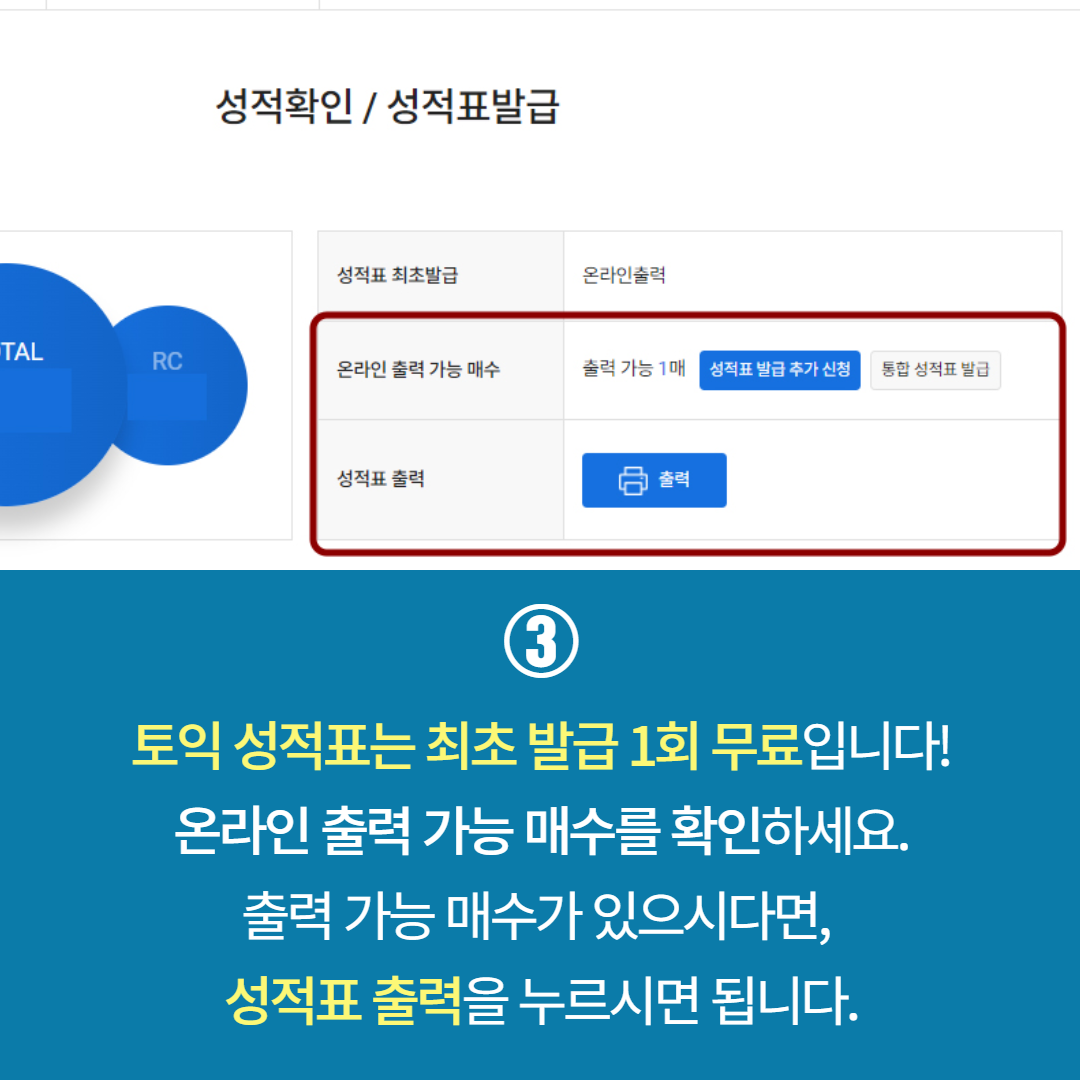 ③ 토익 성적표는 최초 발급 1회에 한해 무료입니다. 온라인 출력 가능 매수를 확인하세요!