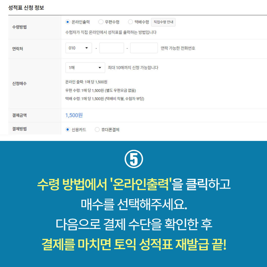 ⑤ 수령 방법에서 ‘온라인 출력’을 클릭하고 매수를 선택해주세요. 다음으로 결제 수단을 확인한 후 결제를 마치면 토익 성적표 재발급 끝!