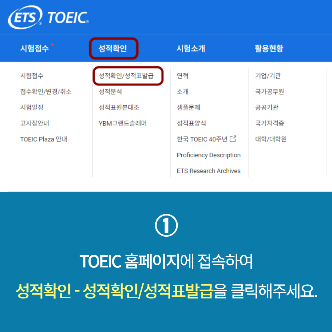 ① TOEIC 홈페이지에 접속하여 성적확인 카테고리를 클릭, 성적확인/성적표발급을 클릭해주세요.
