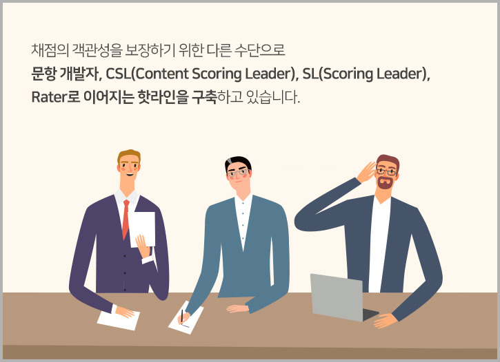 채점의 객관성을 보장하기 위한 다른 수단으로 문항 개발자, CSL(Content Scoring Leader), SL(Scoring Leader), Rater로 이어지는 핫라인을 구축하고 있습니다.
