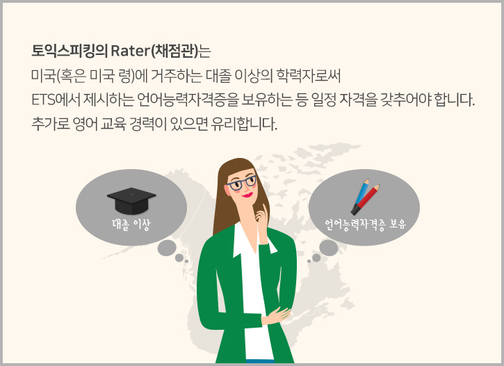 토익스피킹의 채점관(Rater)은 미국(혹은 미국령)에 거주하는 대졸 이상의 학력자로써 ETS에서 제시하는 언어능력자격증을 보유하는 등 일정 자격을 갖추어야 합니다. 추가로 영어 교육 경력이 있으면 유리합니다.