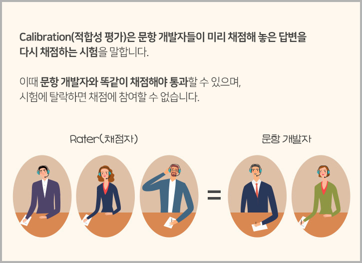 Calibration(적합성 평가)은 문항 개발자들이 미리 채점해 놓은 답변을 다시 채점하는 시험을 말합니다. 이때 문항 개발자와 똑같이 채점해야 통과할 수 있으며, 시험에 탈락하면 채점에 참여할 수 없습니다.