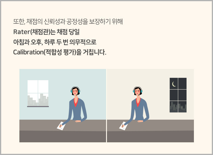또한, 채점의 신뢰성과 공정성을 보장하기 위해 Rater(채점관)는 채점 당일 아침과 오후, 하루 두 번 의무적으로 Calibration(적합성 평가)을 거칩니다.
