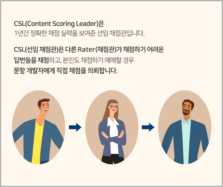 CSL(Content Scoring Leader)은 1년간 정확한 채점 실력을 보여준 선임 채점관입니다. CSL(선임 채점관)은 다른 Rater(채점관)가 채점하기 어려운 답변을 채점하고, 본인도 채점하기 애매할 경우 문항 개발자에게 직접 채점을 의뢰합니다.