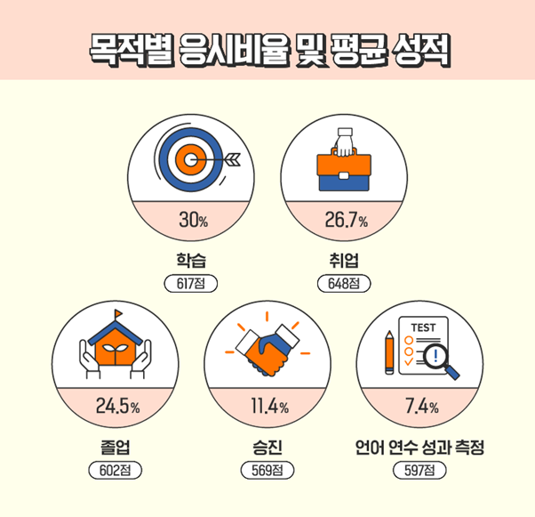 응시자마다 TOEIC 응시 목적도 다를 수밖에 없겠죠. 응시 목적으로는 학습(30%)이 가장 높게 나타났고, 취업(26.7%), 졸업(24.5%), 승진(11.4%), 언어 연수 성과 측정(7.4%) 순으로 집계됐습니다. 흥미로운 점은 응시 목적에 따라 점수 차이가 크게 벌어졌다는 점인데요. 취업 목적의 응시자 평균 성적은 648점으로 1위를 차지했지만, 승진 목적의 응시자 평균 성적은 569점으로 가장 낮게 나타났습니다. 또한 학습과 졸업 목적의 경우도 각각 617점, 602점으로 비교적 높은 성적을 기록했습니다.