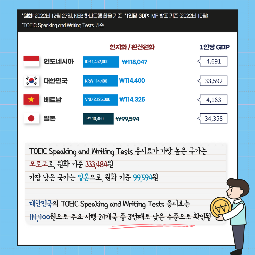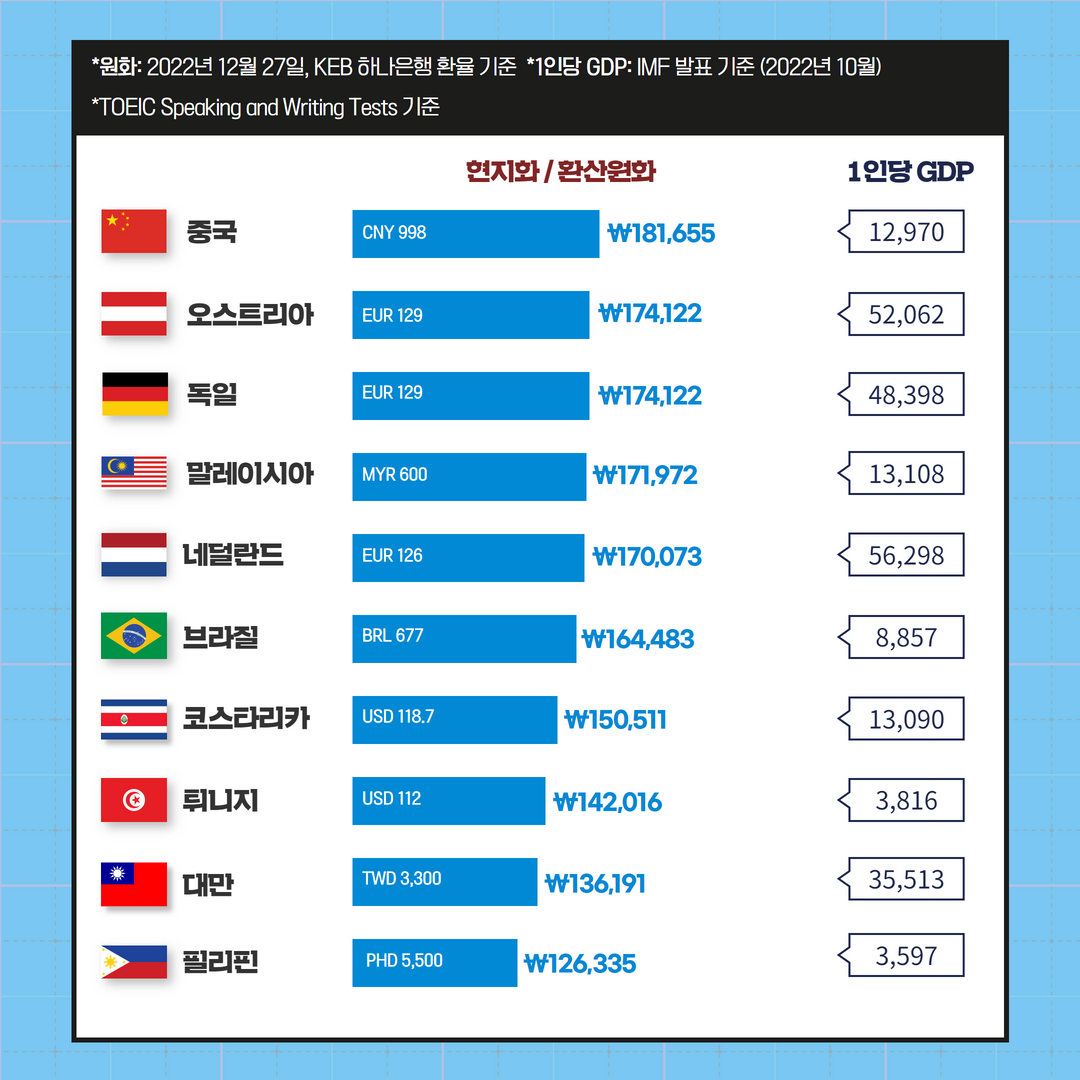 다른 나라의 토익 응시료는 얼마? TOEIC 시행 주요 국가별 응시료 현황 (2022년 12월)