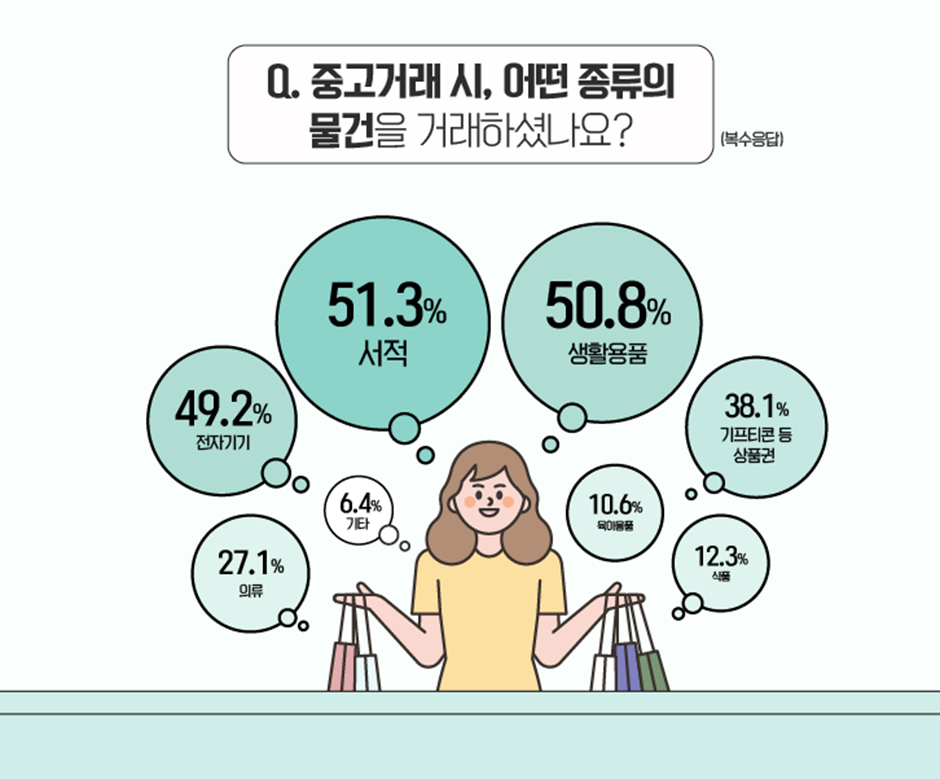 ‘생활용품(50.8%)’과 ‘전자기기(49.2%)’가 차례로 그 뒤를 이었는데요. 실생활에 빈도 높게 사용되는 물건들이 많이 거래되는 것으로 볼 수 있겠습니다. :) 다음으로는 ‘기프티콘 등 상품권(38.1%)’이 4위, ‘의류(27.1%)’가 5위를 기록했으며, ‘식품(12.3%)’과 ‘육아용품(10.6%)’이 근소한 차이로 뒤를 이었습니다.