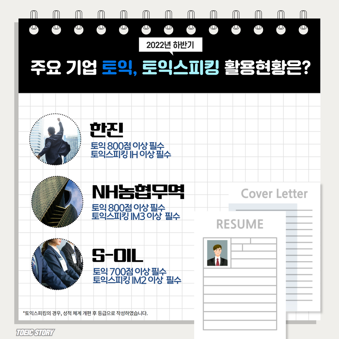 | S-OIL | TOEIC 700점 이상, TOEIC Speaking IM2 이상 필수 |
