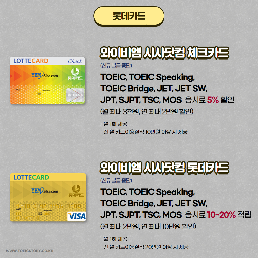 TOEIC, TOEIC Speaking, TOEIC Bridge, JET, JET SW, JPT, SJPT, TSC, MOS 응시료 10~20% 적립 (월 최대 2만원, 연 최대 10만원 할인) |