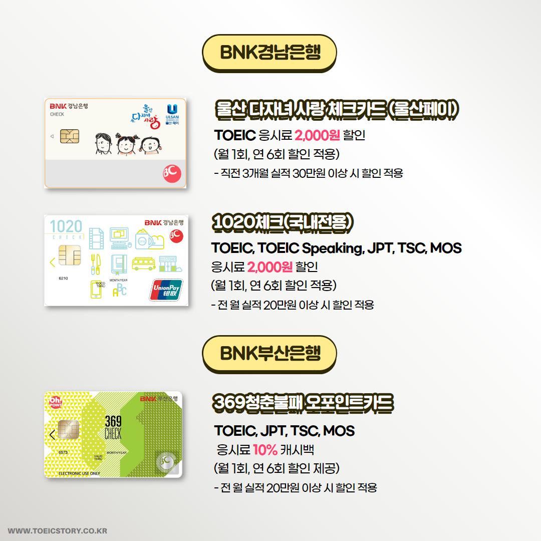 | BNK경남은행 | 울산 다자녀 사랑 체크카드 (울산페이) | TOEIC 응시료 2,000원 할인 |