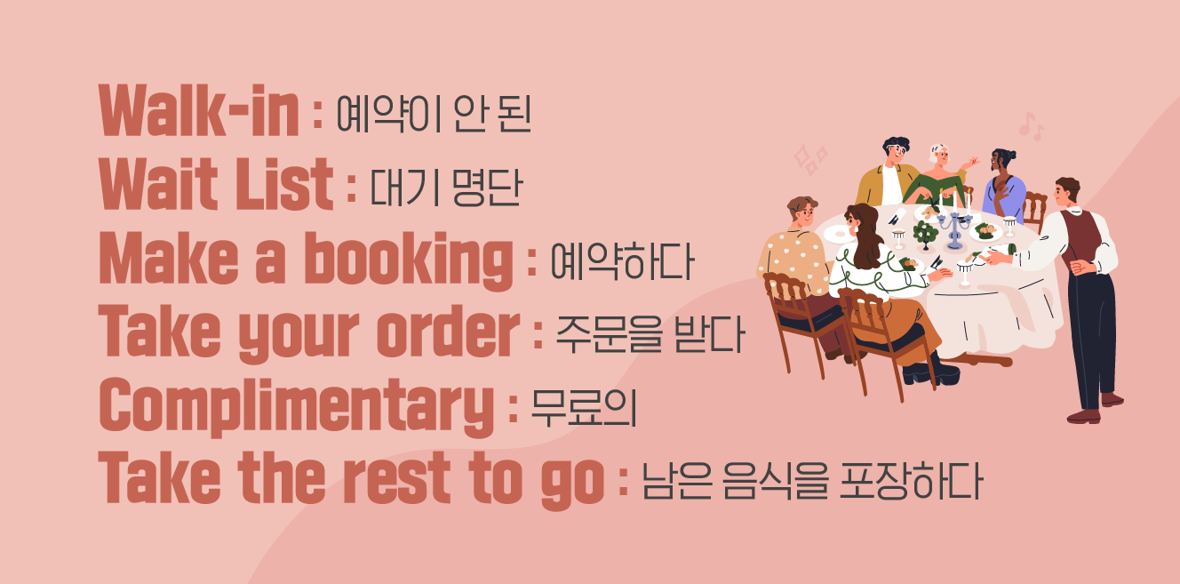 레스토랑에서 매끄럽게 주문을 진행하기 위해 예약과 관련된 표현을 알아두면 좋은데요. 식사 전 미리 예약하는 것은 ‘Make a booking(예약하다)’이라 하며, ‘Walk-in(예약이 안 된)’한 손님은 자리가 있는 경우에 즉시 이용할 수 있습니다. 또, 대기 명단에 이름을 올리고 기다리는 것은 ‘Wait List(대기 명단)’라고 하는데, 예약이 꽉 찬 레스토랑에서는 필수적이죠!