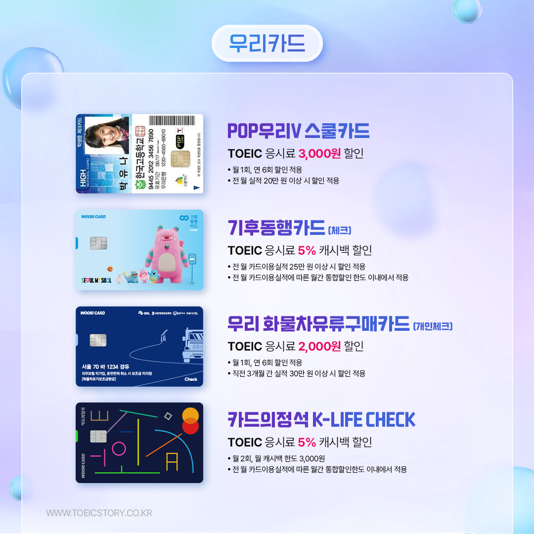 | 우리카드 | POP우리V 스쿨카드 | TOEIC 응시료 3,000원 할인 |