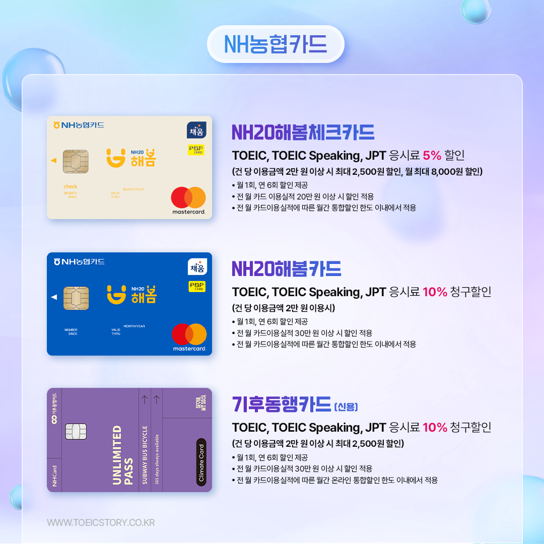 | NH20해봄카드 | TOEIC, TOEIC Speaking, JPT 응시료 10% 청구할인 (건 당 이용금액 2만 원 이용시) |