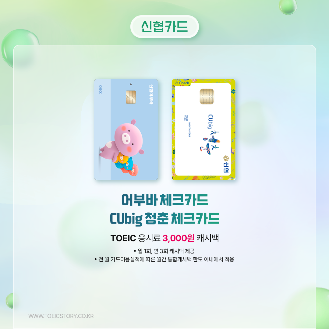 | 신협카드 | 어부바 체크카드 | TOEIC 응시료 3,000원 캐시백 |