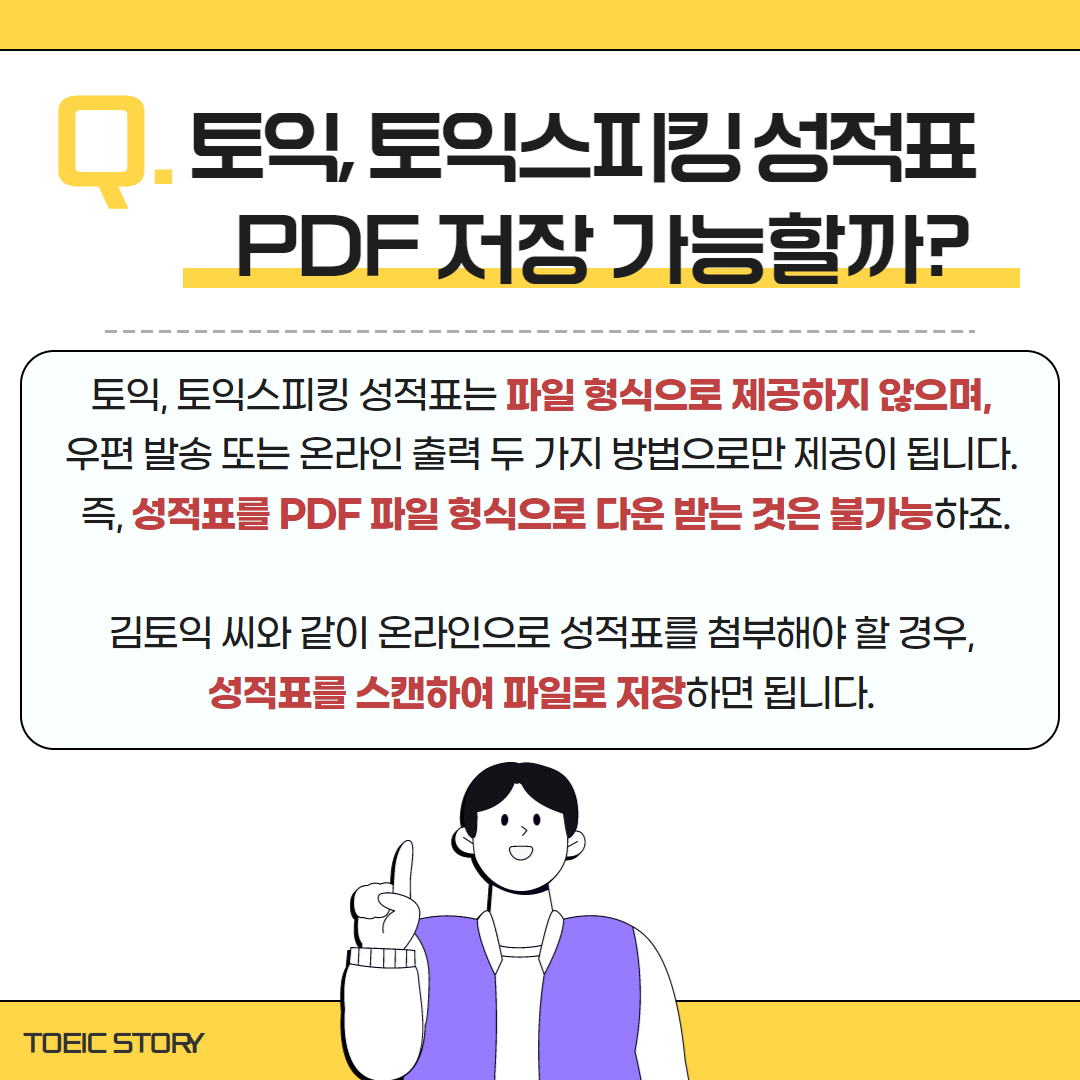 토익, 토익스피킹 성적표는 파일 형식으로 제공하지 않으며, 우편 발송 또는 온라인 출력 두 가지 방법으로만 제공이 됩니다.